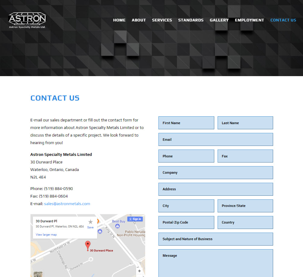 CryoDragon Website Design Astron Metals Contact Page